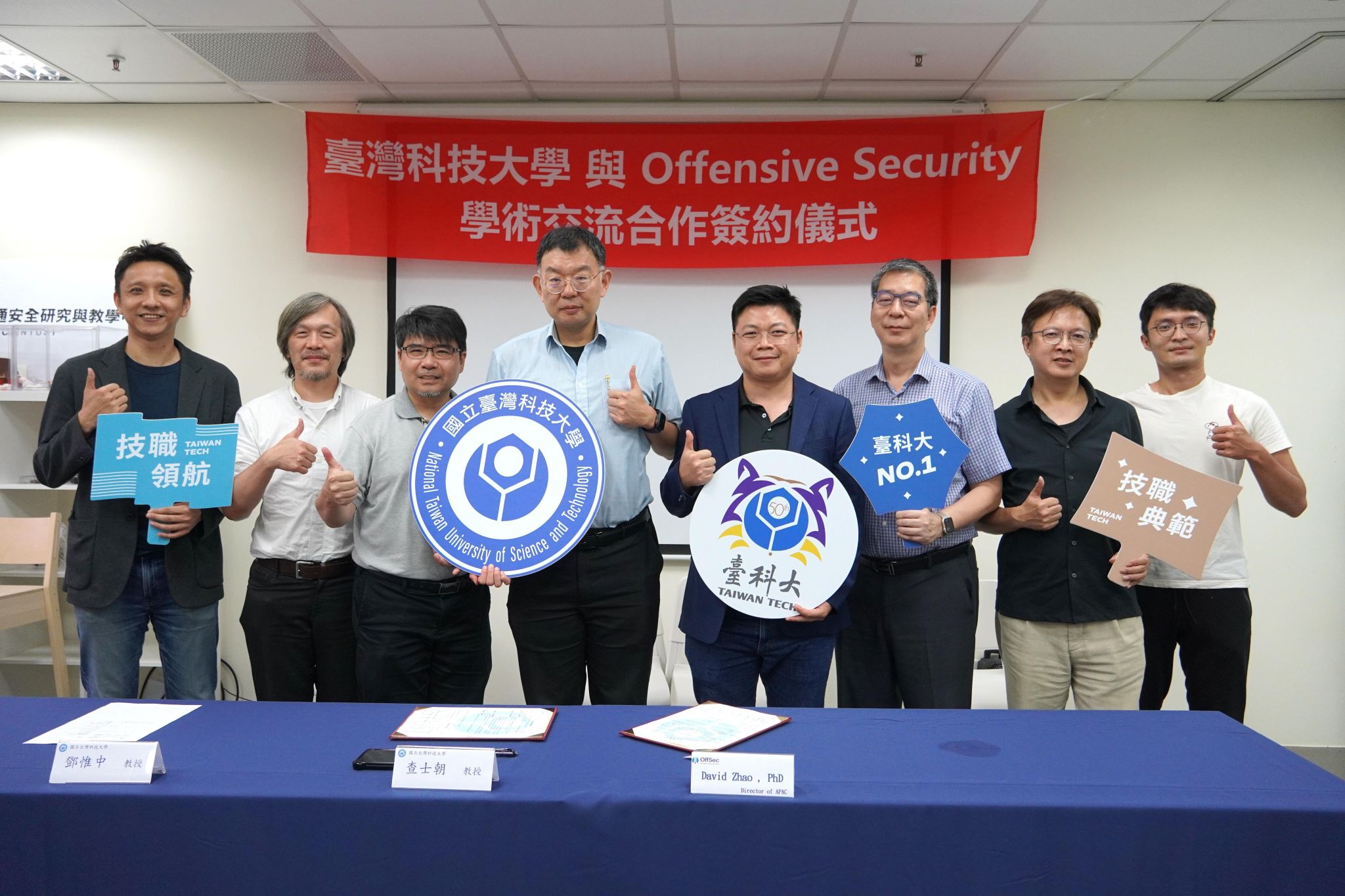 雙方已於日前舉辦MOU簽約儀式,由臺科大電資學院前副院長鄧維中教授、臺科大資管系暨資通安全研究與教學中心主任查士朝教授,以及OffSec 亞太區負責人 David Zhao共同見證,象徵跨國合作正式展開,不僅強化臺灣教育科技的國際鏈結,也展現積極引進全球先進平台的決心。